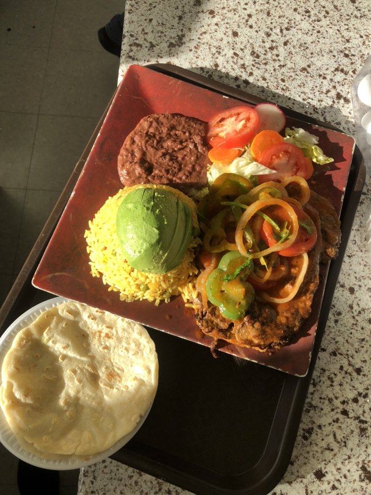 Typical salvadorean plate. Carne de res a la placha, arroz, frijoles enteros, huevo estrellado, chorizo, agucate, chimol, chimol, queso y platano -grilled steak, rice, whole beans, fried egg, saussage, avocado, chimol, cheese, and plantain.